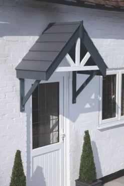 Made from a blend of engineering polymers to make a composite material, widely used in architectural features. High strength to weight ratio and will not deteriorate due to weather in the way timber does. Designed to fit over a standard-width UK front door. Supplied ready-decorated and is protected with a UV-stable coat to prevent colour fading from sunlight. Wall fixings and drill bit included.