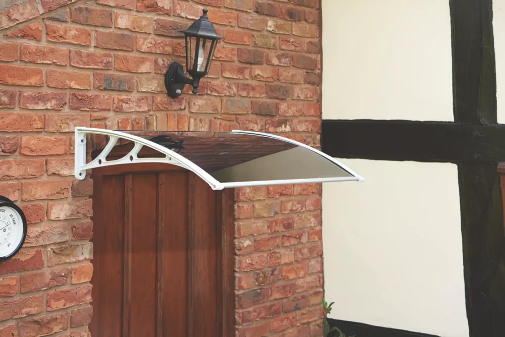 Lightweight, yet durable, door canopy that provides cover from both sun and rain. Features heat reflecting UV-stabilised polycarbonate cover and high impact-resistant side brackets. Aluminium front and rear profiles with a rubber seal at the back ensure a secure fit. Supplied with wall fixings.