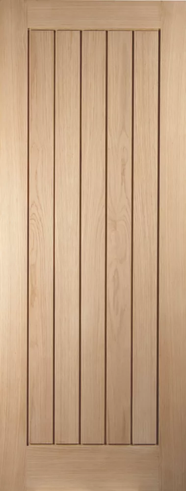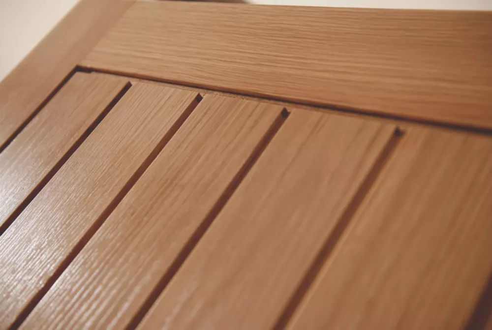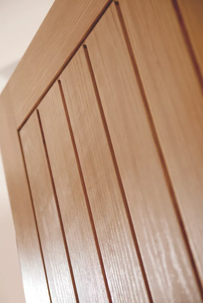 American white oak veneer over particle board with vertical lines. Can be trimmed by 5mm from all 4 edges. Reduced sound transmission.