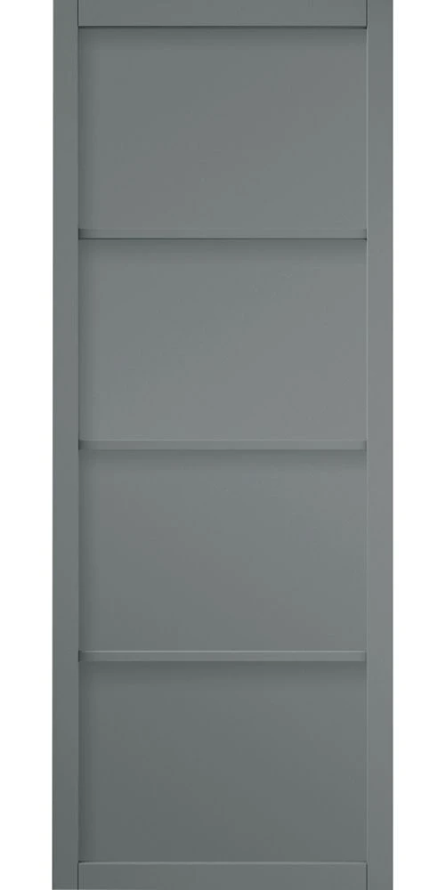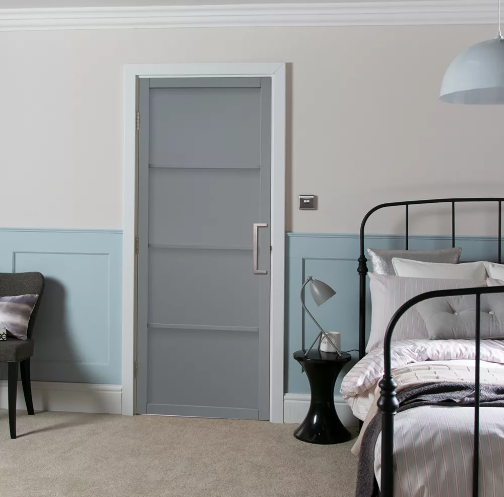 Contemporary slimline door, ideal for modern apartments and homes. Fits most existing door frames. Solid core for a premium feel. Grey paint finish.
