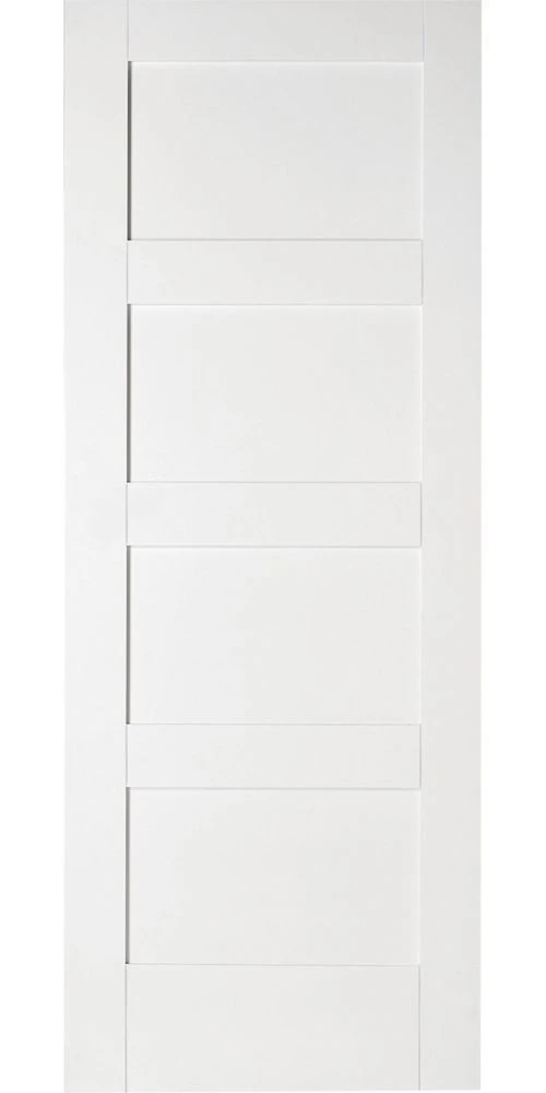 Minimal design with 4 wooden horizontal panels. Solid construction offers a heavyweight feel when opening and closing. Pre-primed in white and ready for painting. 35mm thick to fit into most existing door frames.