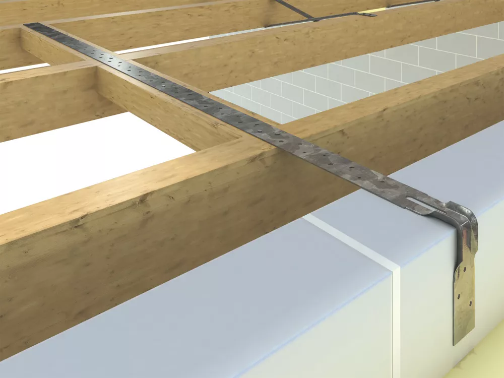 No ordinary restraint strap. Engineered with reinforced ridges on the bend to provide strength where it’s needed most. Provides lateral restraint to masonry, joists and can be fitted over truss bottom chords. Thinner, lighter and much easier to carry. Built-in mortar key slot. Fits easily over floor joists. Can be installed without notching joists.