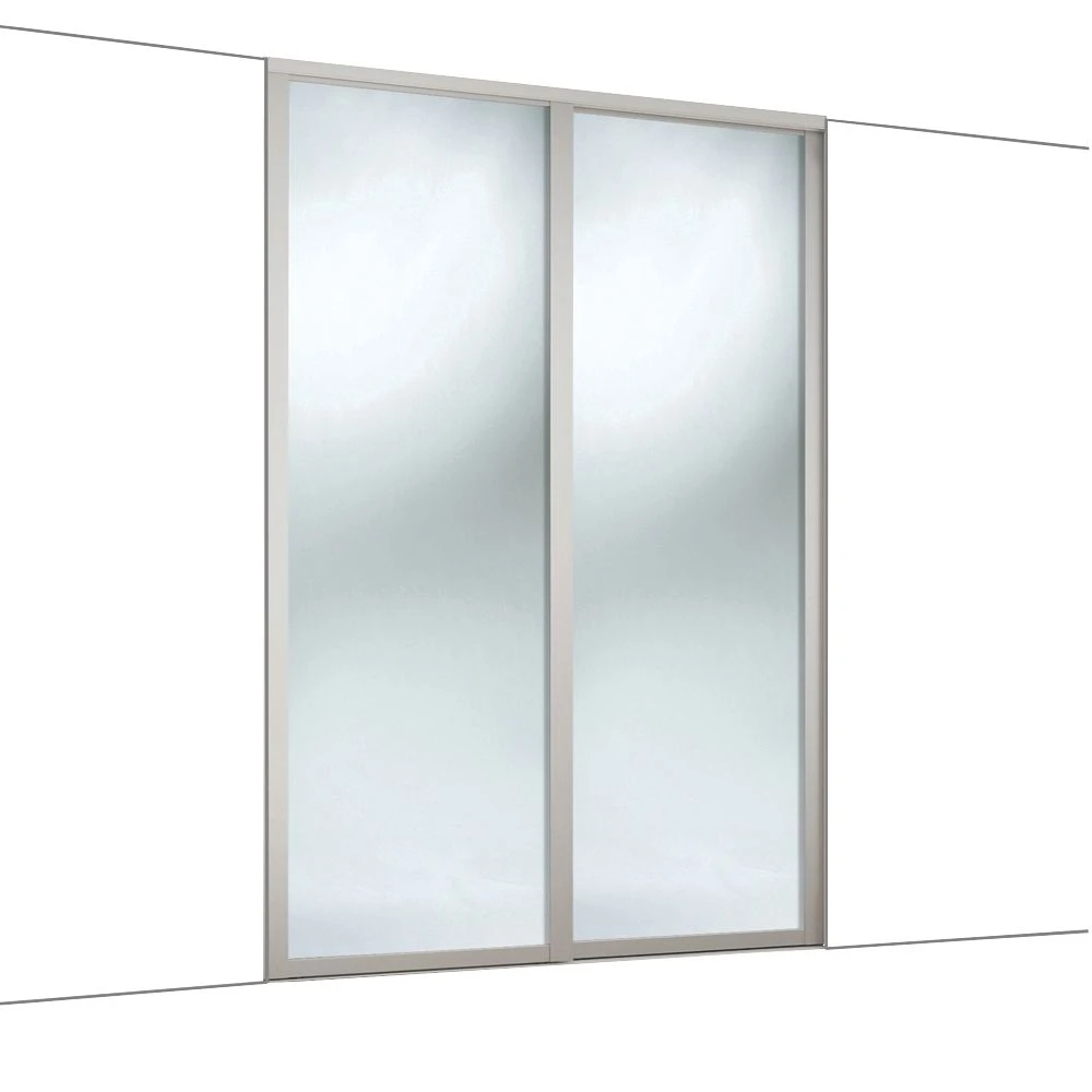 Mirrorred panels and dove grey frame with matching track set thats lightweight and smooth running. Ideal space-saving solution.