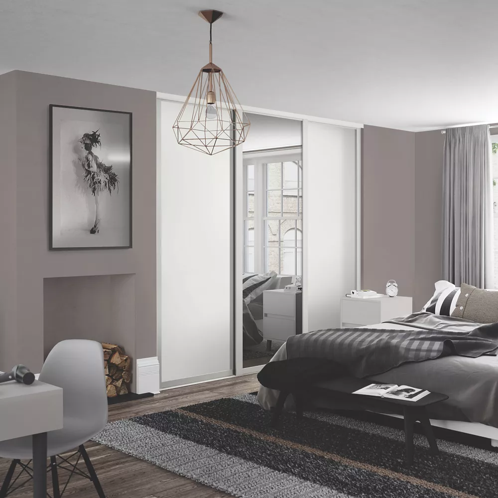 Mirrorred panels and white frame with matching track set thats lightweight and smooth running. Ideal space-saving solution.
