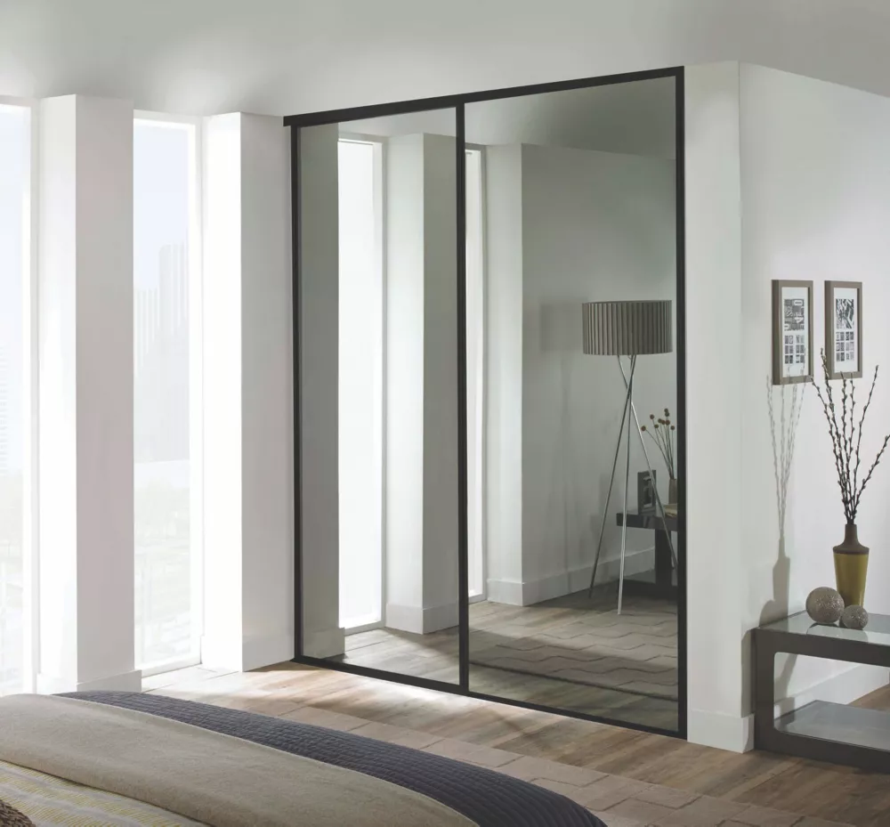 2 classic, black framed mirror, sliding wardrobe doors. Ready assembled to fit onto matching trackset supplied.