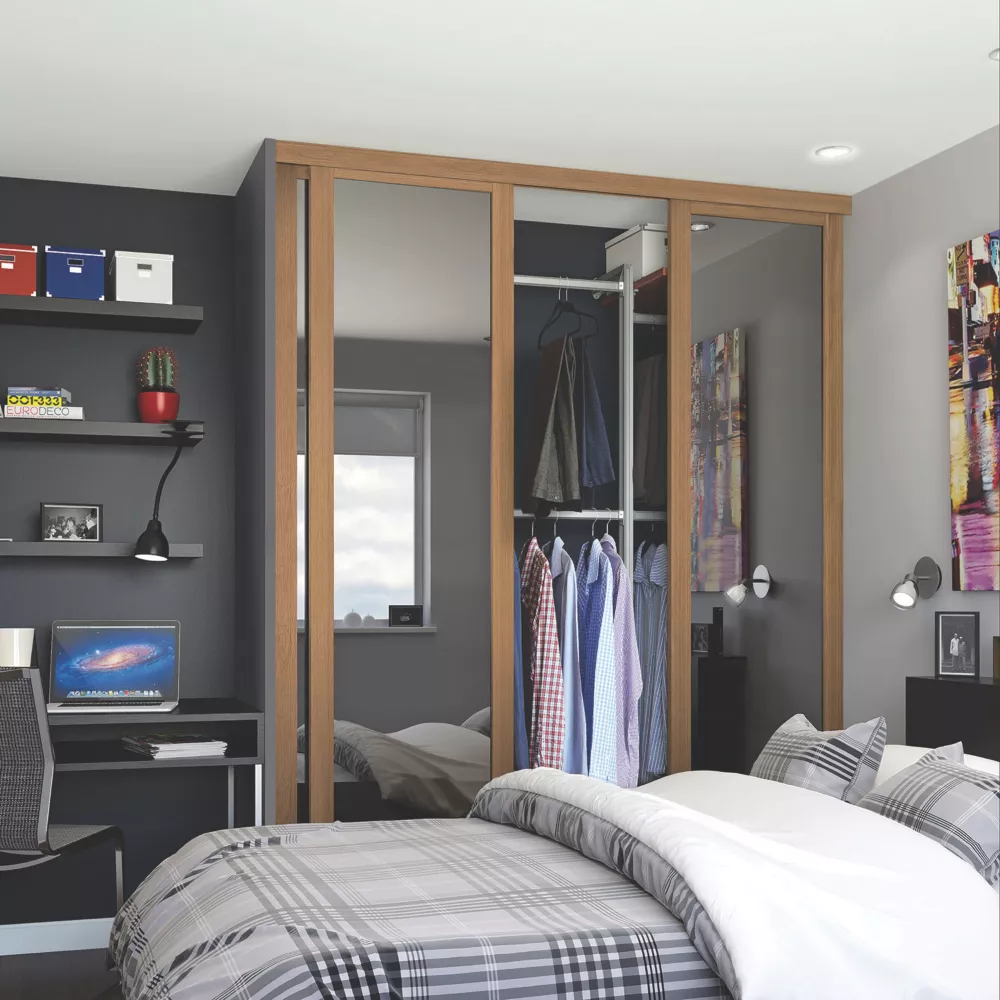 3 shaker style, oak framed mirror, sliding wardrobe doors. Ready assembled to fit onto matching trackset supplied.