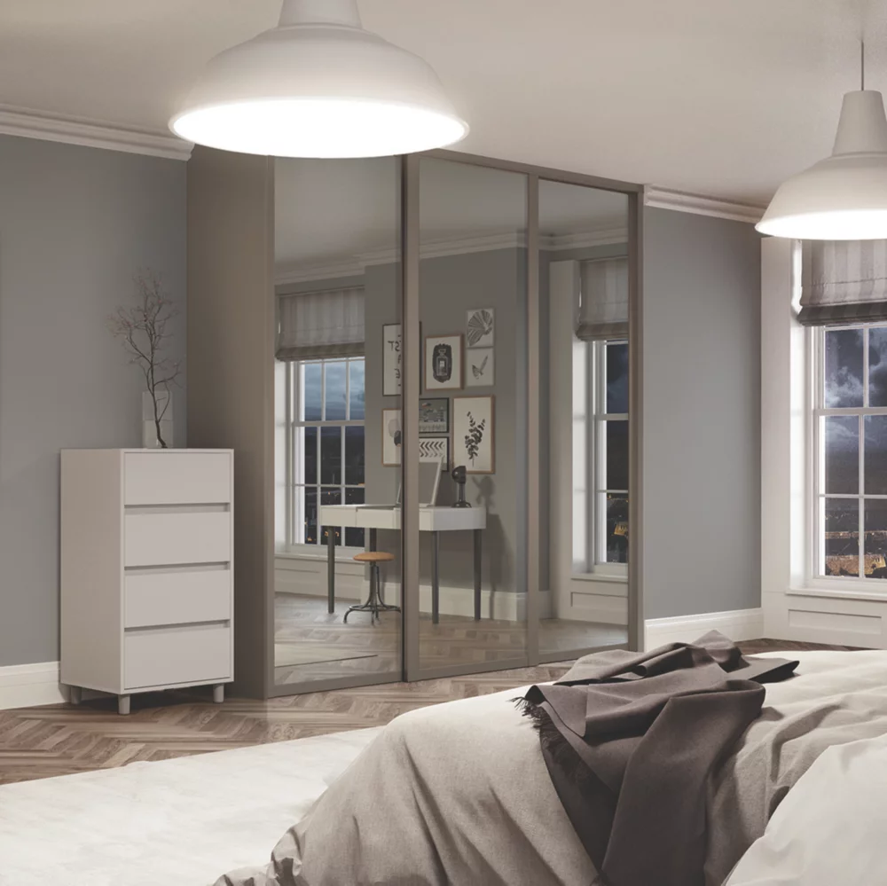 Spacepro Shaker 3-Door Sliding Wardrobe Door Kit Stone Grey Frame Mirror Panel 1680 X 2260mm