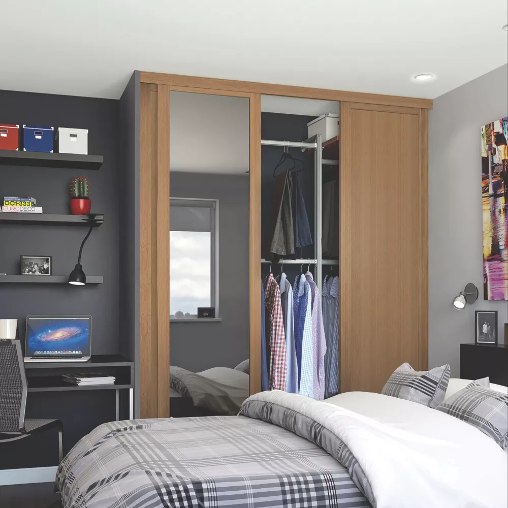 2 x shaker style, oak panel doors and 1 oak framed mirror, sliding wardrobe door. Ready assembled to fit onto matching trackset supplied.