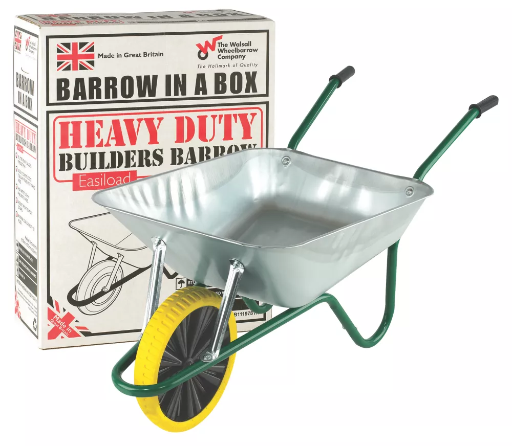 Heavy duty, galvanised wheelbarrow with rust-free pan and puncture-proof wheel.